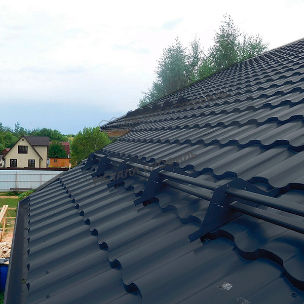 Профиль Монтекристо-S характеризуется симметричной волной с высотой ступеньки 25 мм и шириной волны 350 мм. Такая геометрия имитирует натуральную керамическую черепицу, но с улучшенной жесткостью благодаря толщине металла 0,5 мм. Это позволяет материалу выдерживать значительные снеговые нагрузки без деформации. Профиль оптимизирован для быстрого монтажа, с удобными замковыми соединениями, минимизирующими отходы. В цвете серый графит он выглядит современно и стильно, подчеркивая архитектурные формы здания. Длина листов может варьироваться от 0,5 до 8 метров, что упрощает адаптацию под любые размеры крыши.
