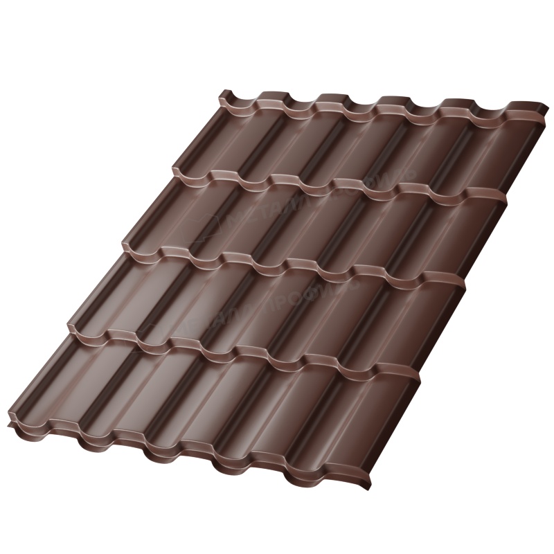 Коллекция включает варианты с матовыми и глянцевыми покрытиями в широкой цветовой гамме. Эта модель выделяется шоколадным оттенком, подходящим для архитектуры в стиле кантри или модерн. Производится на современном оборудовании с контролем качества на каждом этапе. Доступны листы длиной от 0,5 до 8 метров, что позволяет адаптировать под любые проекты. Коллекция ориентирована на долговечность, с гарантией до 20 лет.
