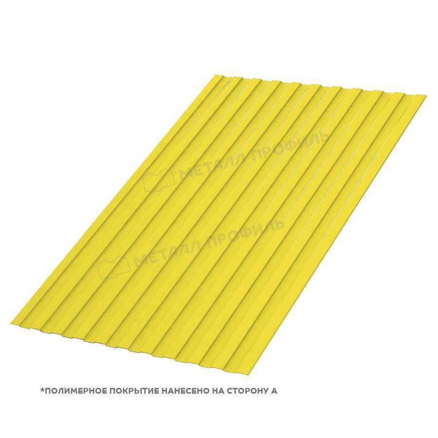 Профлист С-8 с толщиной 0,45 мм и покрытием из полиэстера в цвете RAL 1018 (желтый цинк) представляет собой надежный материал для ограждений и фасадов. Он сочетает прочность металла с эстетичным внешним видом, подходящим для различных строительных задач. Сторона A обеспечивает оптимальную защиту и долговечность.